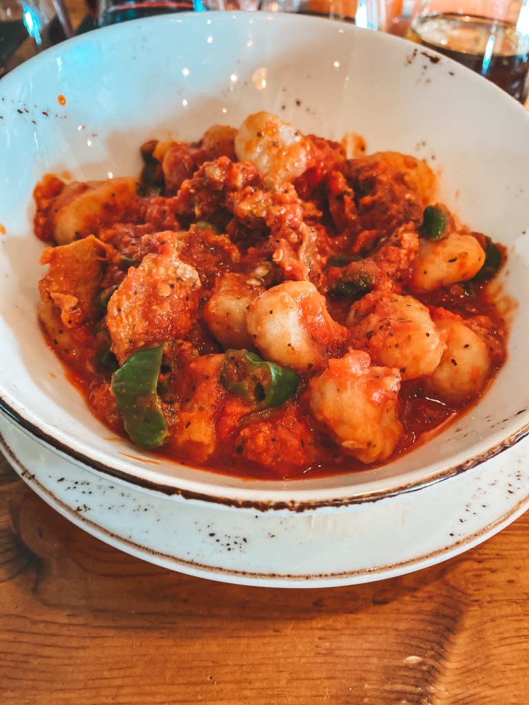 I tried the Vegan Gnocchi Peperonata to eat – also super delicious! Kate got the Queen pizza (similar to the Margherita pizza at local pizza places) while Allison did a salad and half sandwich combo.