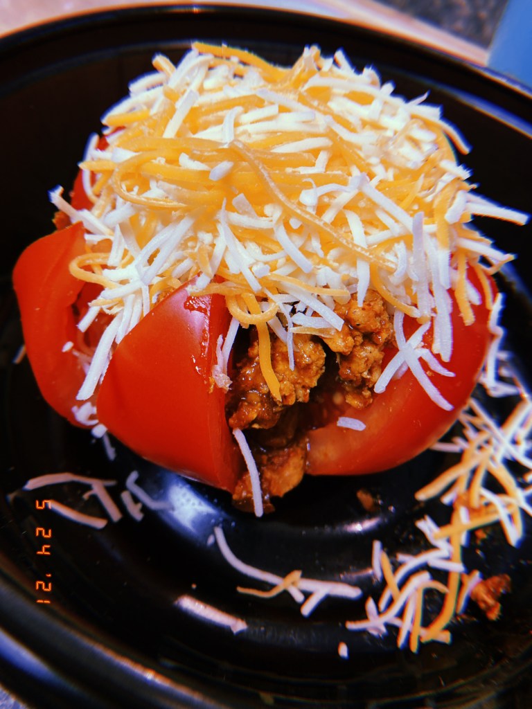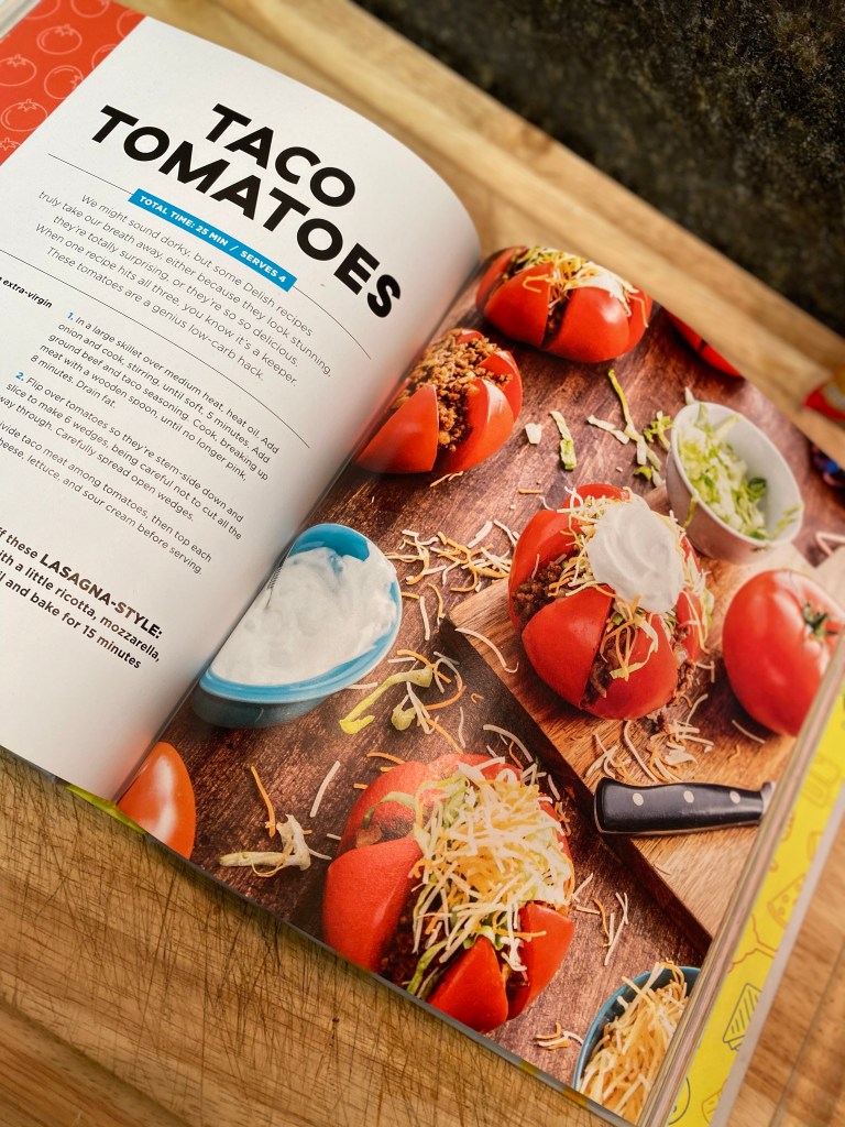 Well today I finally busted out my Delish cookbook and made Taco Tomatoes! If you’re not a tomato fan (like my boyfriend, which I honestly don’t understand. I love tomatoes) this will not be the recipe for you.