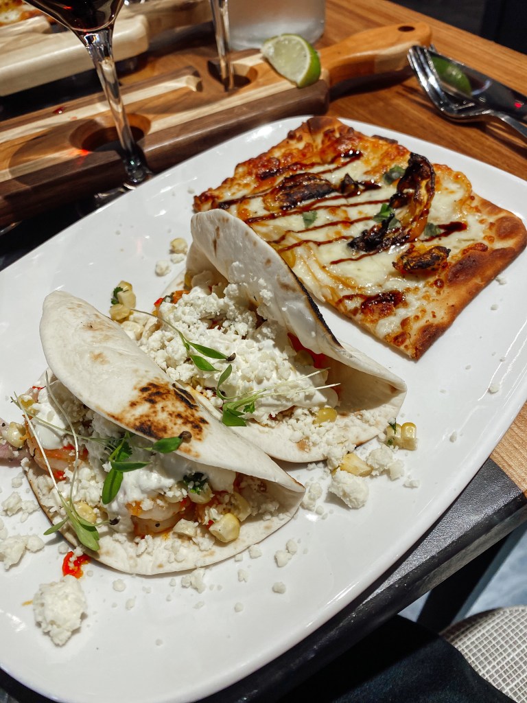 The wine tasted amazing! My mother and I even split two appetizers to try. We pairs our wine flights with the chef’s choice of Cajun shrimp tacos and a Margherita flatbread pizza to share.
